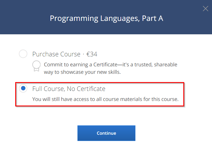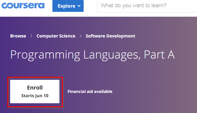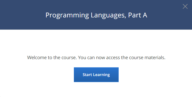 Login (or register if you have no account). Go to the course you want to attend to, in this example I take “Programming Languages, Part A”. Please note that the option described here are not possible for all courses.